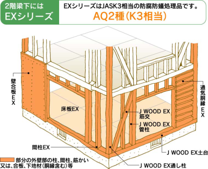 ワンズキューボは工場で防腐防蟻薬剤を乾式注入した高耐久性部材JWOOD EXを使用し「腐らない」「シロアリにも負けない」家づくりを行い、建物の長寿命化を実現しています。