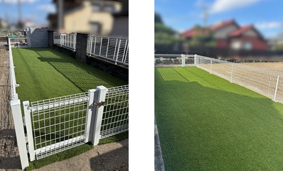 3m幅の1枚ものの人工芝を使い、ジョイントから草が生えてくる心配もないようにしました。